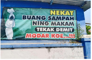Foto di atas adalah poster larangan membuang sampah di sebuah kampung di wilayah Kabupaten Karanganyar, Jawa Tengah. Poster tersebut mengespresikan kemarahan warga kepada para pembuang sampah di makam. Poster peringatan berbahasa Jawa tersebut jika dalam bahasa Indonesia berarti, Jika nekat membuang sampah di makam, kamu akan dicekik oleh makhluk halus. Mati Kamu!!