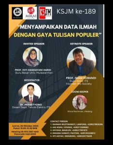 Melalui program rutine IRo-Society yaitu Kajian Spesial Jum’at Malam (KSJM) ke-189 pada Jum’at 6 Oktober 2023, Prof. Imam Robandi selaku founder IRo-Society mengangkat data sebagai obyek bahasan dengan menghadirkan Prof. Esti Handayani Hardi dari Universitas Mulawarman. Topik KSJM malam itu adalah Populer ‘Menyampaikan Data Ilmiah dengan Gaya Tulisan Populer’. Nama Prof. Esti Handayani sebenarnya bukan nama asing di acara KSJM. Beliau pernah menjadi Moderator pada KSJM tanggal 1 Januari 2021 dan KSJM 11 Juni 2021. Pasti bukan tanpa alasan Prof. Imam menghadirkan kembali Prof. Esti Handayani yang kali ini bertindak sebagai invited speaker. IRo-Society yang basicnya adalah perihal menulis memang angotanya memerlukan ‘kejutan-kejutan’ di waktu tertentu agar tetap bersemangat menulis dan kebiasaan menulis tidak mandeg.